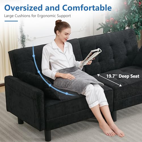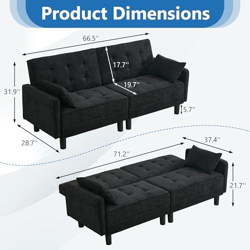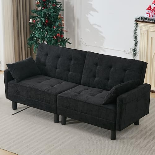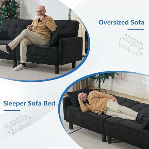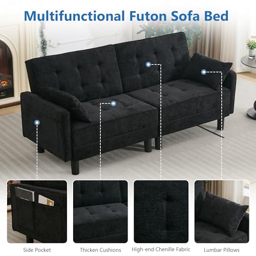 Convertible Futon Sofa Bed, Chenille LoveSeat Sleeper Couch with Adjustable Backrest, Modern Sofa Cama with 2 Pillows, Folding Daybed Couch for Living Room Furniture Apartment (Black, 2 Seat)