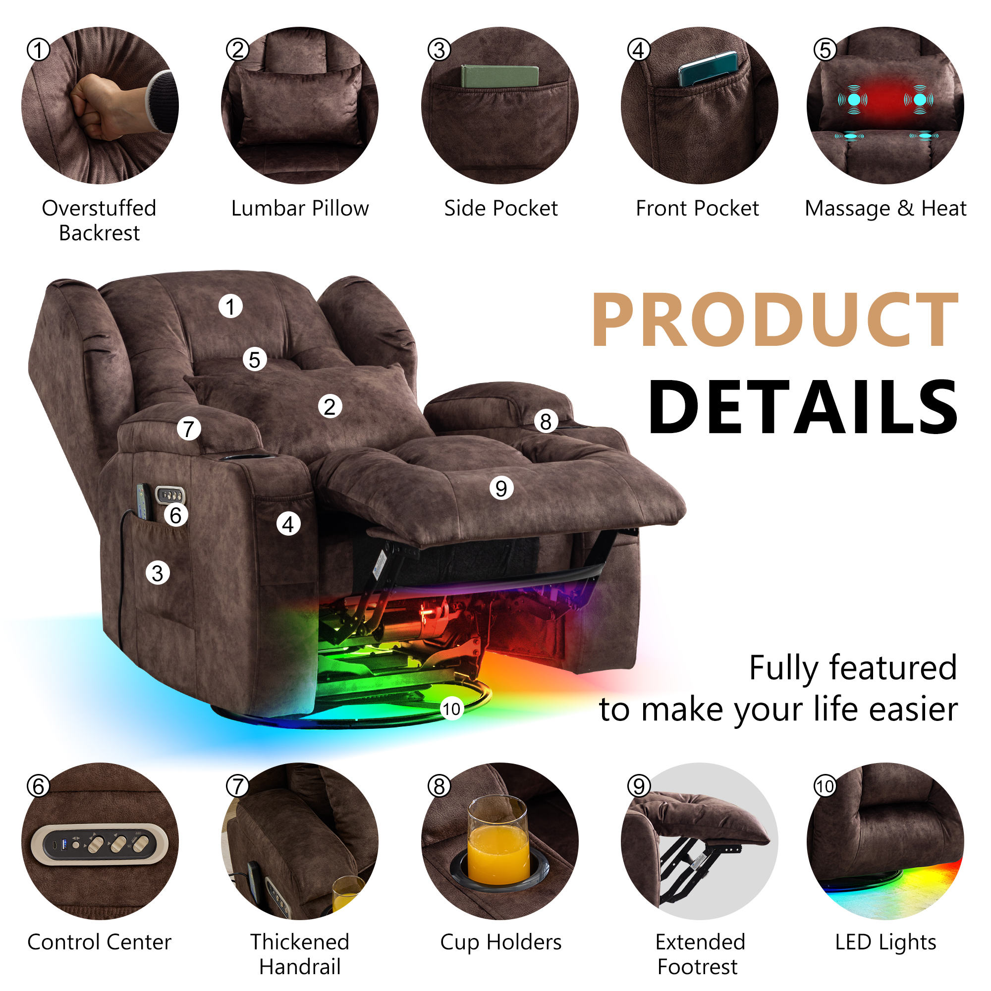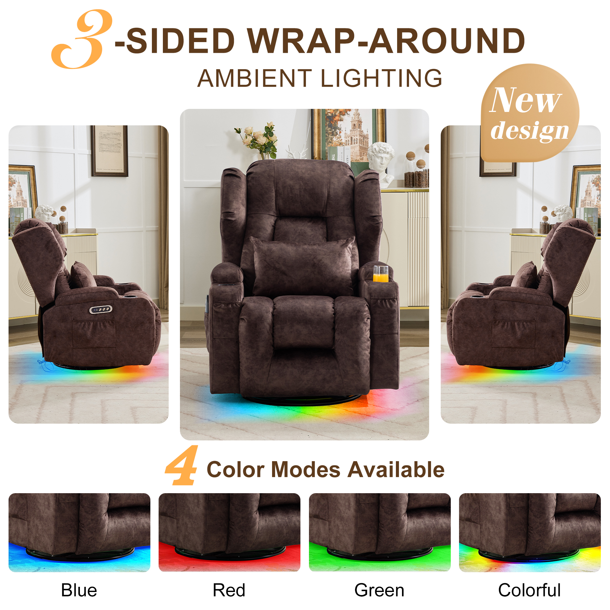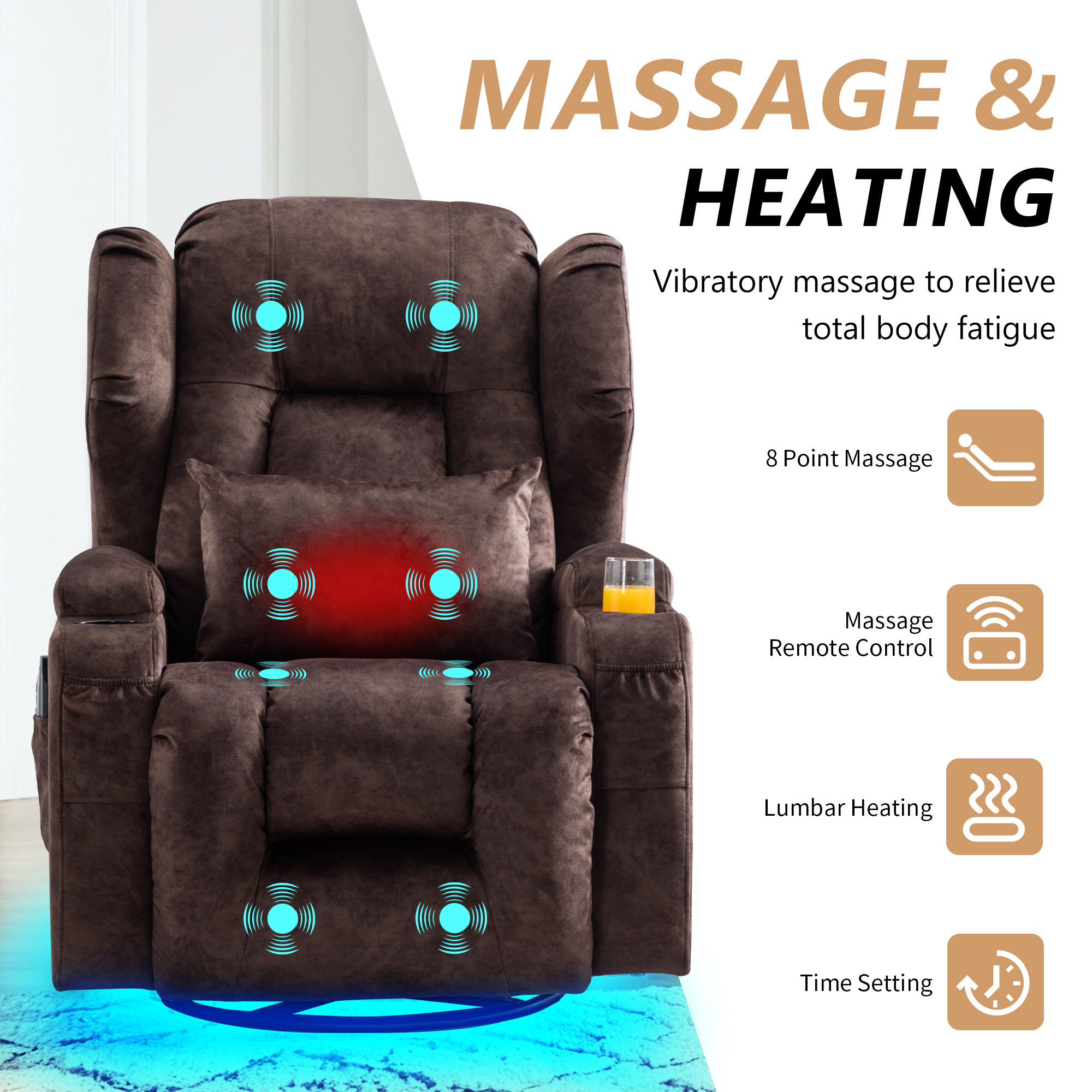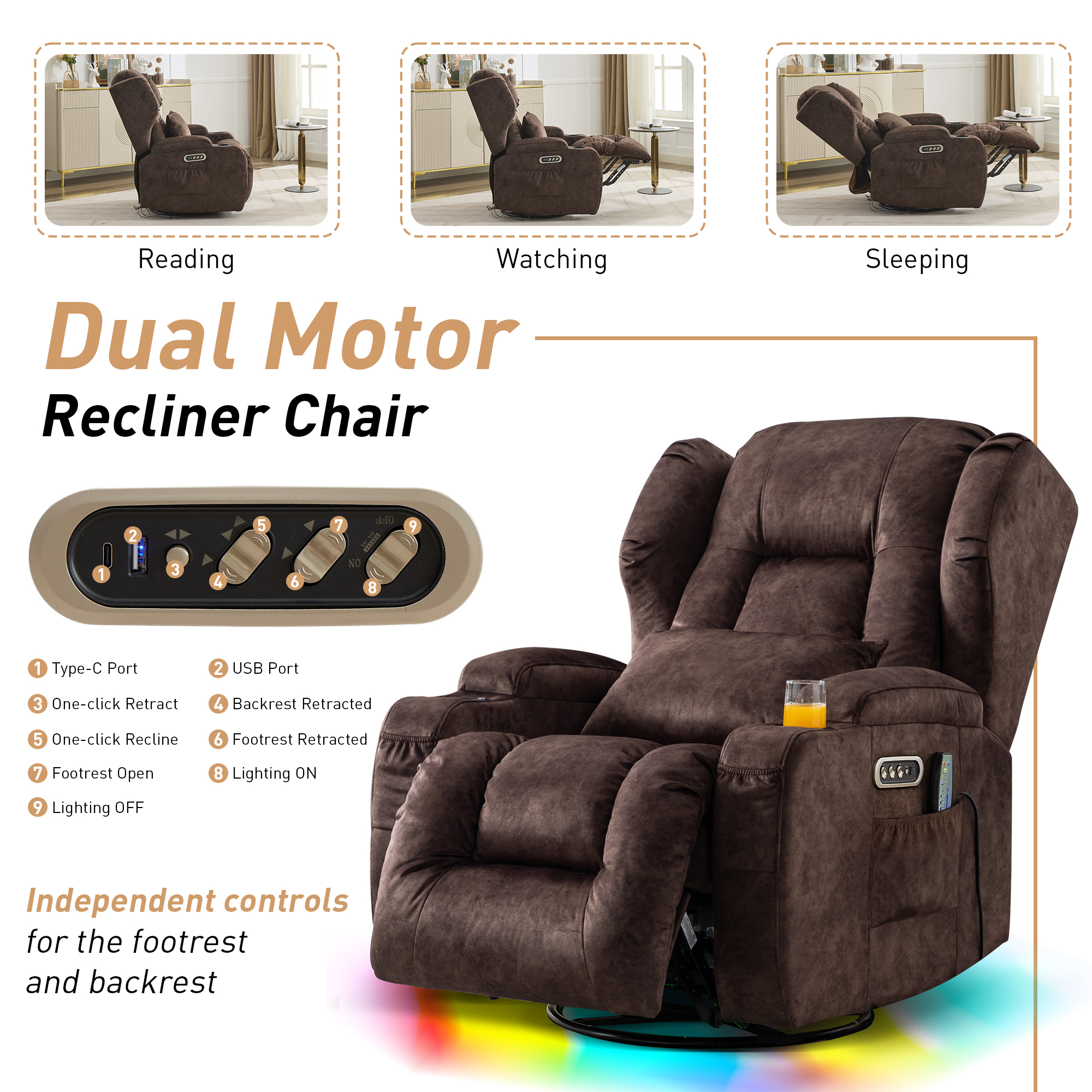 - Dual Motor Rocker Recliner: This swivel recliner features a dual-motor system that allows independent adjustment of the backrest and footrest, while also supporting one-click recline and one-click reset. Designed for ease of use and exceptional comfort