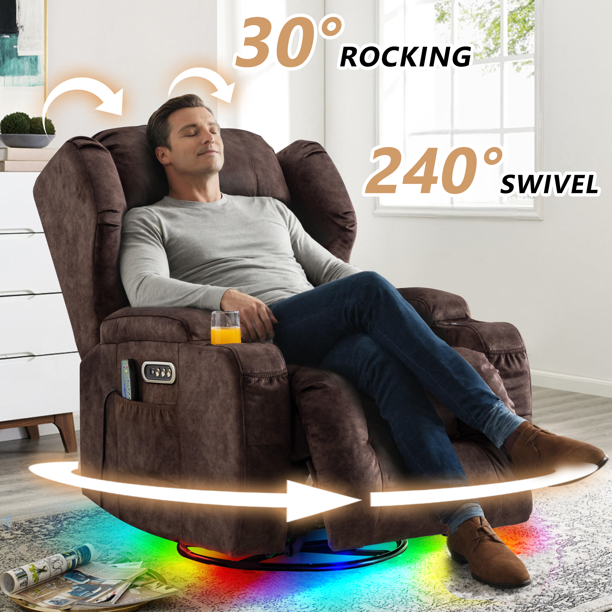 - Swievl Rocker Recliner: The swivel rocker recliner features a 240° swivel capability for effortless rotation, along with a 30° rocking function that provides soothing motion. You also can recline the chair up to 160° for optimal relaxation