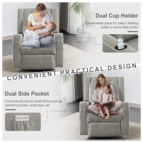 Nursery Glider Recliner Chairs, 360° Swivel Rocker Recliner with Cup Holders, Upholstered Nursing Rocking Chair with Foot Rest for Living Room Bedroom Nursing Room Breastfeeding, Beige